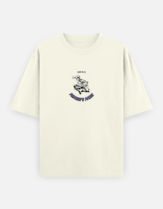 Designed in soft beige cotton, this oversized tee celebrates fearless spirit with panther-inspired graphics. A collector’s edition piece combining minimal tones with bold detail.